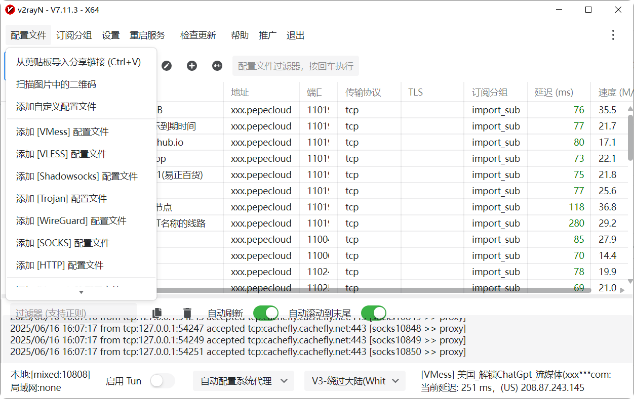 ),然后点击「配置文件」→「从剪切板导入分享链接」。v2rayN 会自动识别并导入。