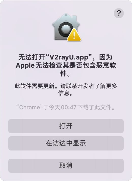 在新出来的授权弹框中 输入登录账户密码,会再出现确认提示框,点击“打开”,V2rayU的图标出现在状态栏中,如下图