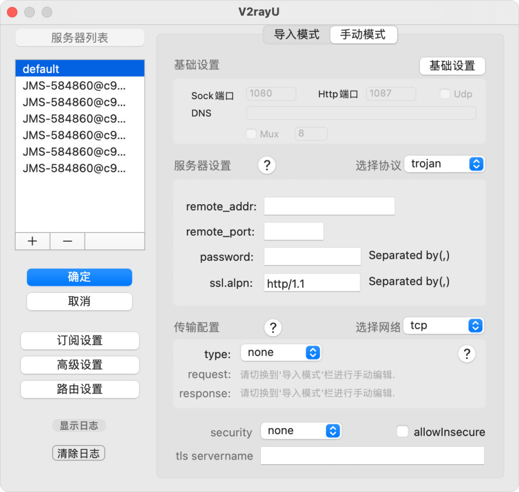 打开主菜单 -> 服务器设置,点击服务器列表处的 ➕ 添加服务器,然后选择手动模式,在选择协议