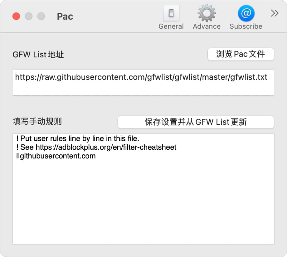 打开主菜单 -> PAC 设置,在这里可以设置PAC文件,默认直接已经选择网址形式并预填了PAC地址,图下图所示,新用户直接默认即可。